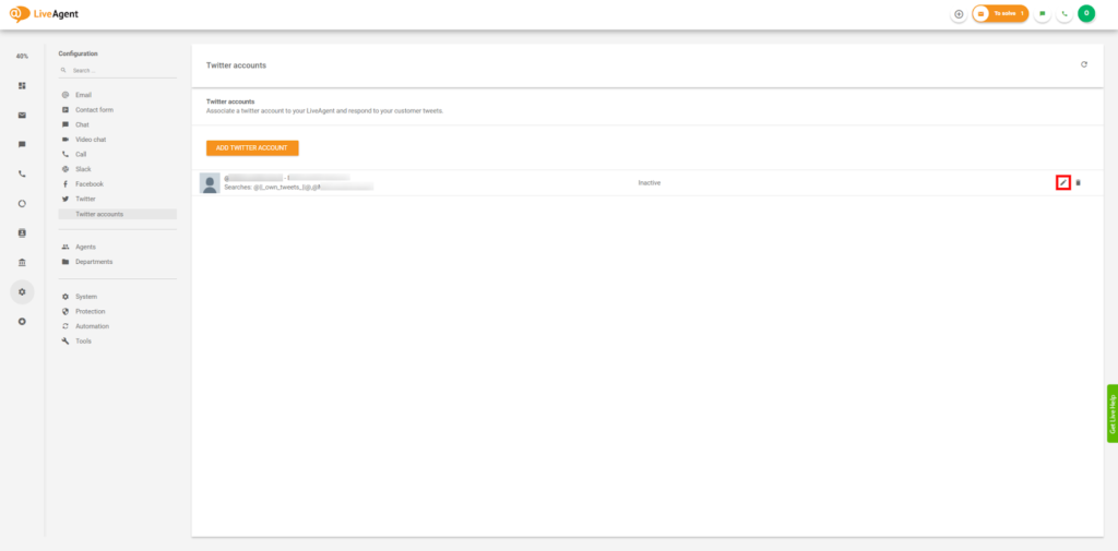 - Nakon što je vaš LiveAgent račun povezan s Twitterom, kliknite na Edit kako biste aktivirali račun