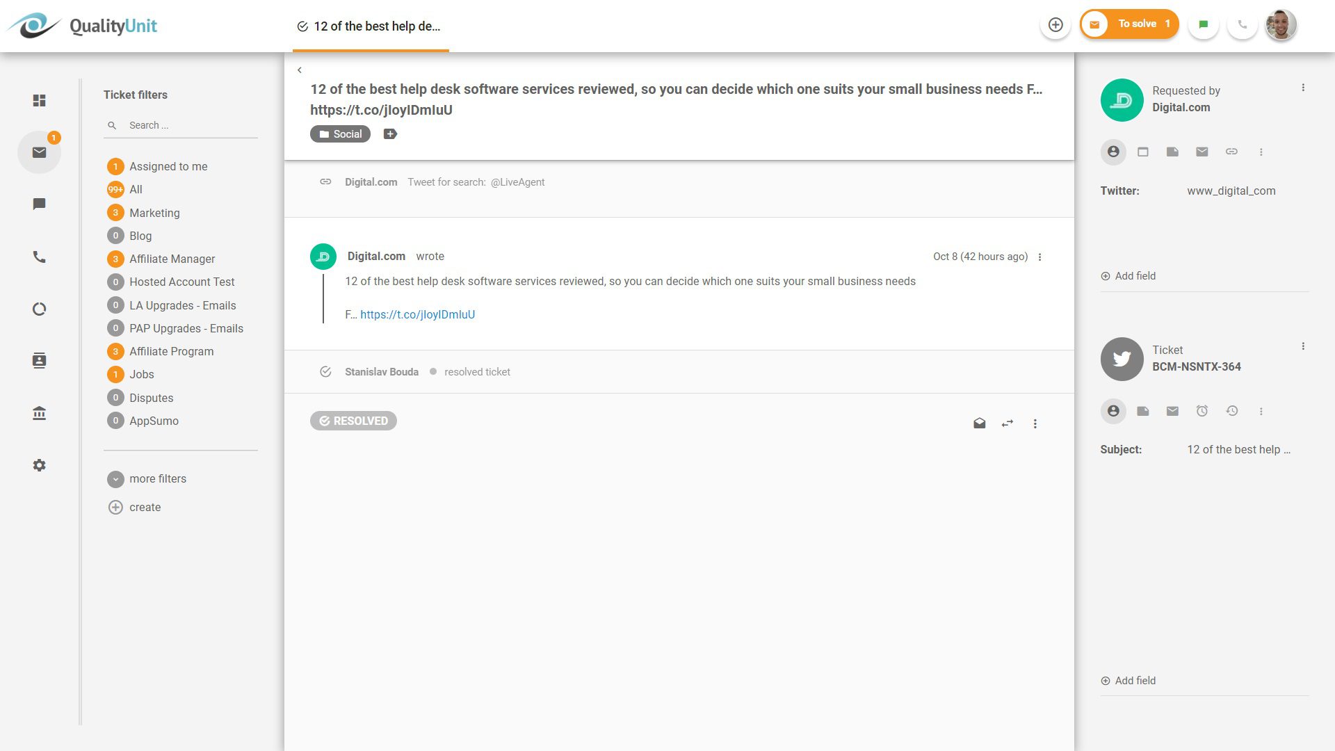 Ne vidite širu sliku? Alternative za službe za korisnike društvenih mreža vam omogućavaju da uvijek budete u toku! Pratite put rješavanja svakog korisničkog problema preko čavrljanja uživo, društvenih mreža, e-pošte ili telefona u jednom razgovoru zahtjeva za podršku. Tako je jednostavno!