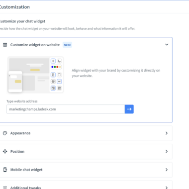Možete prilagoditi svoj chat widget u LiveChat postavkama. Opcije su prilično opširne, pa ako se osjećate kreativno, možete prilagoditi live chat widget prema svojim željama ili brendingu vaših klijenata. Vaše opcije uključuju kako će vaše prozor izgledati u maksimiziranom i minimiziranom prikazu, svijetla ili tamna tema, boju teme (podržana je prilagodba boja) i poziciju chata. Postoji i opcija skrivanja widgeta, prilagođavanja mobilne verzije vašeg chat widgeta i dodatnog podešavanja gdje možete prikazati logotip tvrtke, fotografiju agenta, omogućiti ili onemogućiti zvukove, omogućiti ocjene chata i još nekoliko opcija.