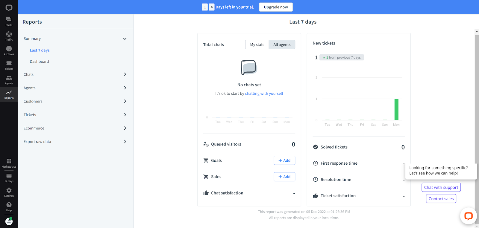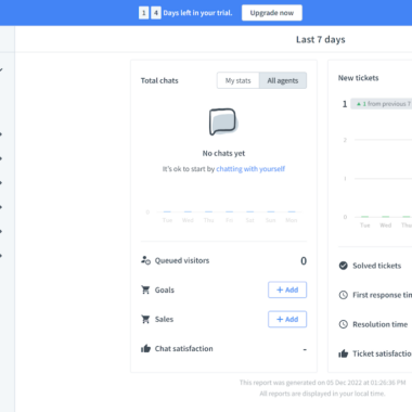 Analitičke značajke nude brzi pregled, kao i dubinski pregled svega vezanog za live chat – chatovi, agenati, klijenti, tiketi i eCommerce-a. Svaki odjeljak vam može dati više informacija i konkretne brojke o vašem live chatu. Ništa ne nedostaje. Pregled analitike daje vam zapis o svemu što se dogodilo tijekom posljednjih sedam dana vašeg korištenja.