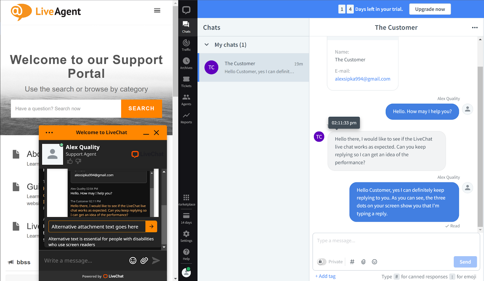 Također sam isprobao slanje privitaka. Kada kliknete na ikonu privitka datoteke, možete odmah odabrati datoteku i poslati je. Možete obrisati privitak bilo kada prije slanja. Za razliku od povirivanja u poruku, agenti ne mogu vidjeti privitak ako još nije poslan, tako da se privatnost klijenta čuva ako prilože pogrešnu datoteku. Privitak vam čak pruža mogućnost uključivanja alternativnog teksta za osobe s invaliditetom. Vrlo pažljiv i izuzetno koristan dodatak.