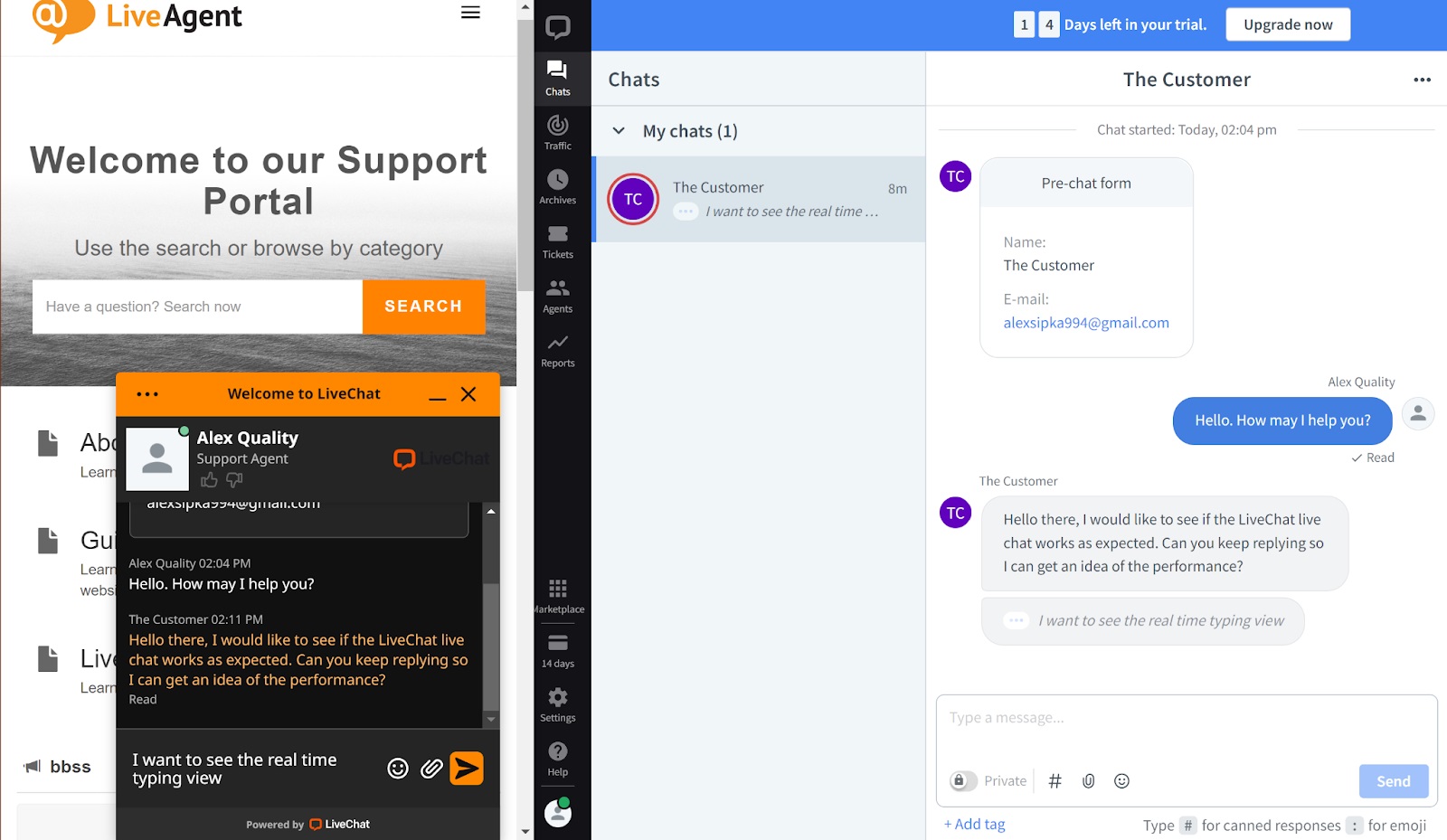 Gledao sam LiveChat live chat widget s obje strane – kao agent i kao korisnik, kako bih dobio potpuno iskustvo. Mogu reći da je sve radilo odlično, kao što se i očekivalo. Kad sam pokrenuo chat kao klijent, automatska poruka me je pozdravila odmah (tu poruku možete prilagoditi u postavkama, pod Targeted messages). Kad je LiveChat upravljačka ploča otvorena, odmah sam dobio vizualnu i zvučnu obavijest o novoj dolaznoj poruci. Prozor preglednika također nastavlja davati obavijest dok ne odlučite kliknuti na njega. Za sada je sve dobro.