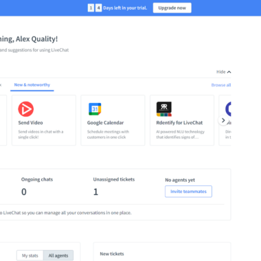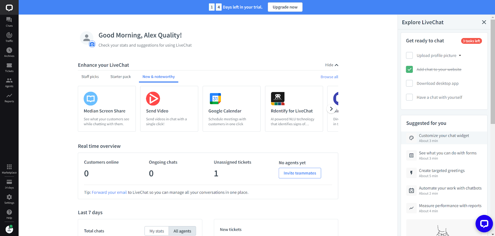 LiveChat je ugledno profesionalno rješenje, a sučelje to odražava. Lako se upoznati s većinom alata i nećete se izgubiti zahvaljujući jednostavnim preporukama u desnom panelu. Možete vidjeti razgovore, promet, tikete, arhive, kontakte i još mnogo toga u izborniku u lijevom panelu. Središte upravljačke ploče prikazuje neke mogućnosti poboljšanja i brzi pregled statistike live chata.