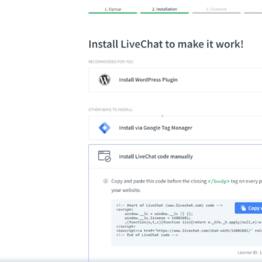 Registracija za LiveChat je vrlo brza. Jednostavno morate registrirati svoj račun, a proces registracije će vas na kraju odvesti izravno na dio za integraciju widgeta za live chat, što znači da možete implementirati svoj live chat odmah. To je iznenađujuće brzo, a LiveChat vam čak nudi nekoliko opcija integracije. Možete odabrati između WordPress plugin-a, Google Tag Managera ili ručne instalacije koda za live chat.