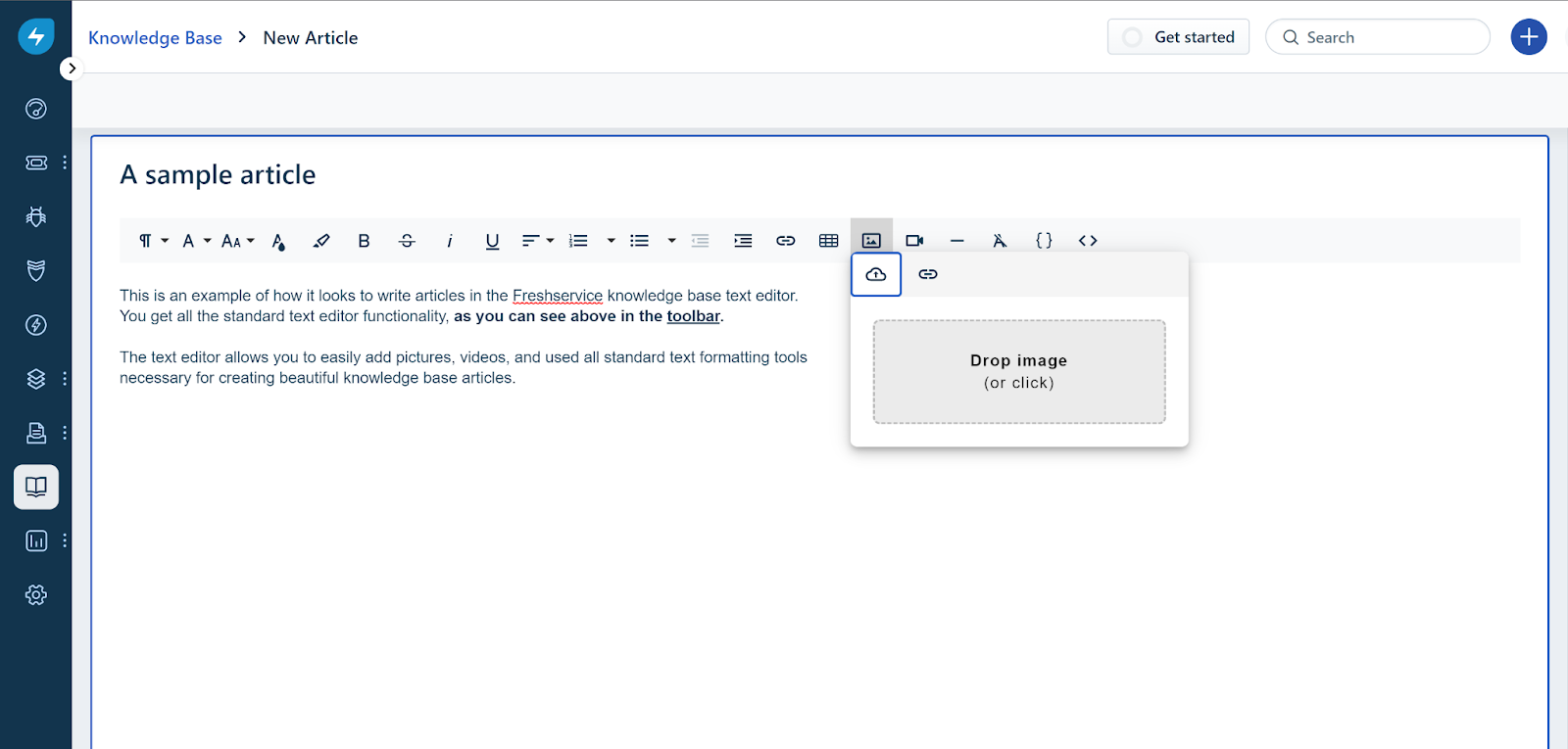 Kada pristupite značajki baze znanja, možete započeti razgledavanje. Sučelje ostaje jednako ugodno kao i ostatak Freshservice aplikacije te vas izravno poziva da počnete pisati članke dok je prazno. Kada kliknete na Create article, odvest će vas do uređivača članaka baze znanja i možete se odmah početi diviti sučelju baze znanja koje je jednostavno za navigaciju.
