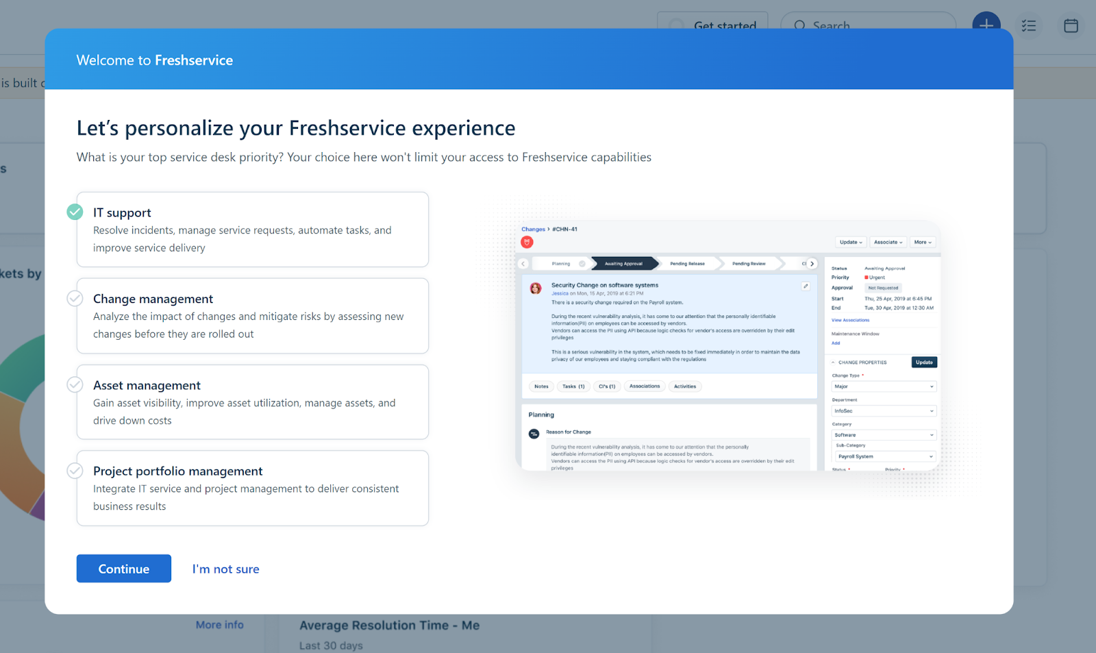 Početak rada s Freshservice-om je lak poput popunjavanja jednostavnog obrasca za registraciju. Nisu potrebne informacije o kreditnoj kartici i ne morate prolaziti kroz proces od više koraka kako bi dobili pristup vašem računu. Potrebno je jedva nekoliko minuta kako bi se počeli upoznavati s vašom upravljačkom pločom. Kada dobijete pristup, odmah na početku će vas pozdraviti vas sučelje modernog izgleda. Nema dostupnih vodiča, ali sučelje je čisto i jednostavno za navigaciju, čak i ako ste potpuno novi korisnik.