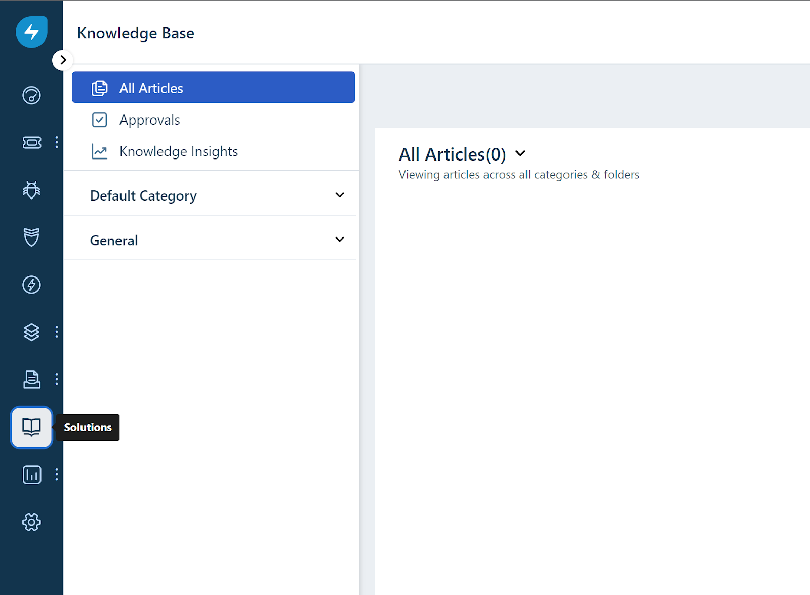 Baza znanja u Freshservice-u se zove Solutions. Možete je pronaći u izborniku u lijevoj traci. Kada kliknete na to, odvest će vas do baze znanja i možete početi pisati.