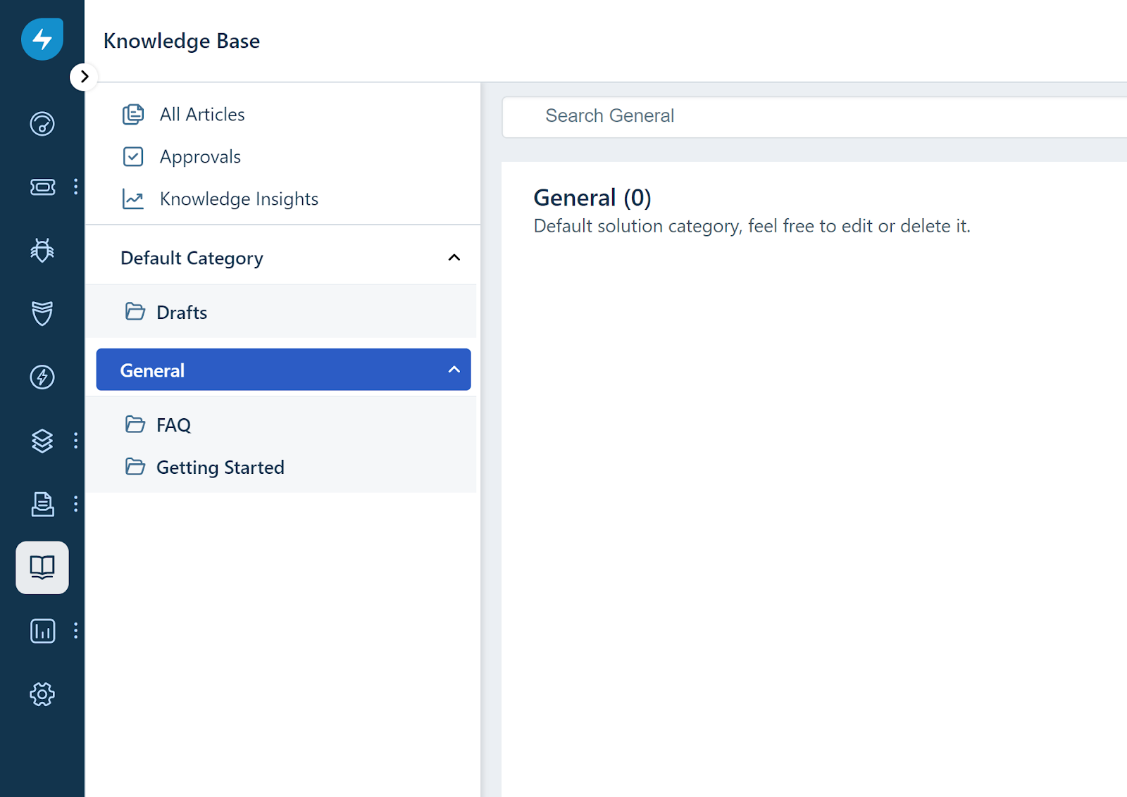 Pronaći bazu znanja u Freshservice-u je malo zbunjujuće jer iako se ona zove Knowledge base, stavka u izborniku jednostavno kaže Solutions. Iako shvatiti da se Solutions odnosi na bazu znanja nije bilo teško, mogu zamisliti da novi korisnici možda neće biti u istoj situaciji. Solutions se može lako odnositi na FAQ za softver ili vodič za početak rada. Nevezano za ovaj mali problem, stavku Solutions možete naći u lijevoj izborničkoj traci.