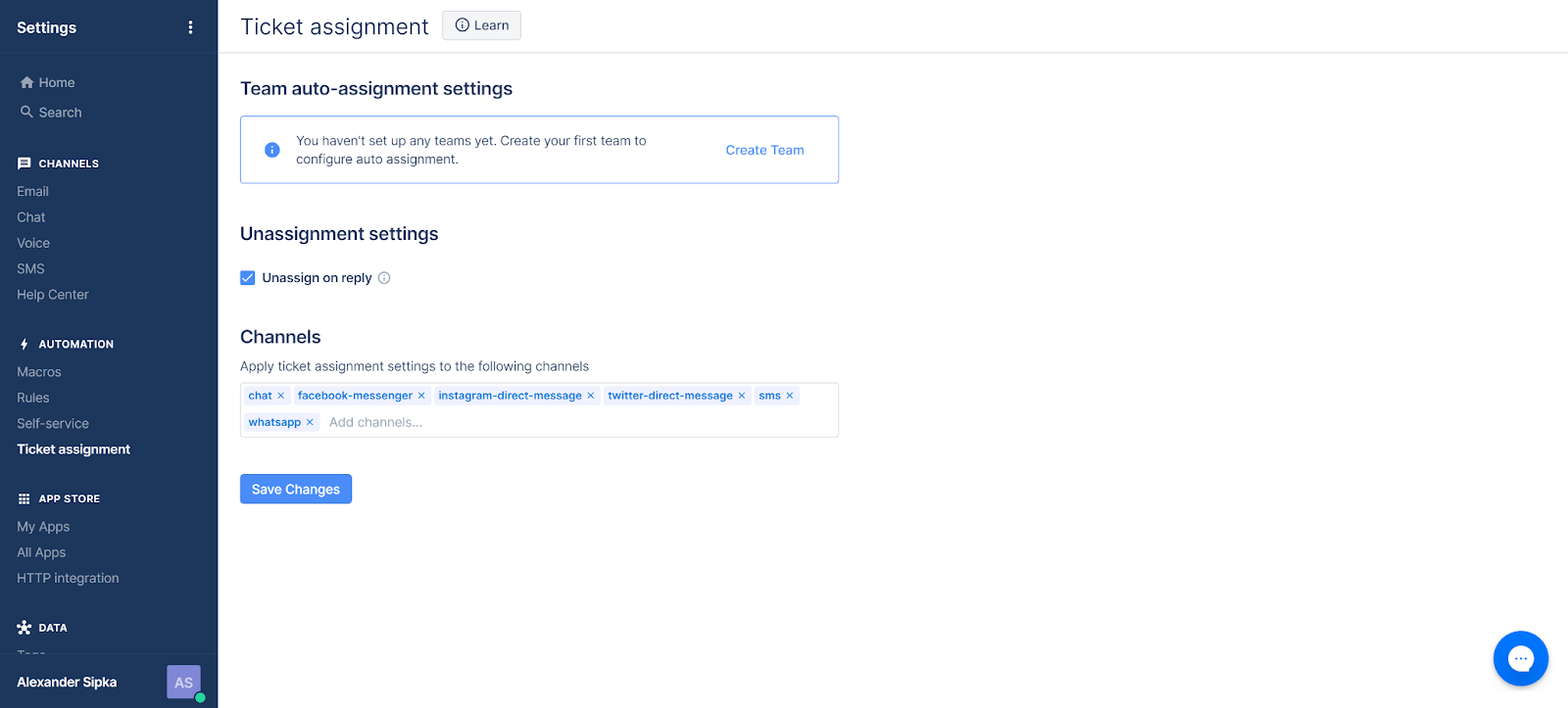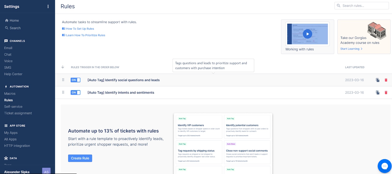 Jedna stvar koju nisam mogla isprobati čak ni s besplatnim probnim razdobljem jest Twitter integracija. Dostupna je samo u višim planovima, ali temeljem mog iskustva s Facebookom i Instagramom, pretpostavljam da radi jednako dobro. Gorgias također nudi makronaredbe za stvaranje jednostavnih automatiziranih odgovora i drugih radnih procesa, pravila za poboljšanu organizaciju tiketa i još mnogo toga, kao i postavke dodjele tiketa.