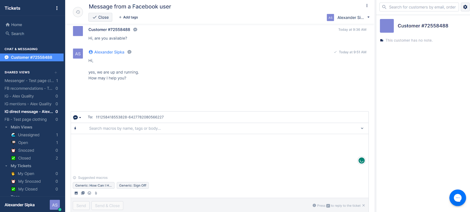 Prva stvar koju sam isprobala je slanje poruke putem Messengera i s radošću mogu reći da je odmah dostavljena u tiketing sustav, u roku od samo jedne sekunde. Odgovaranje radi vrlo dobro i možete koristiti značajke poput privitaka, emotikona ili slanje videozapisa i slika. Cijenim što polje za odgovor također nudi prijedloge makronaredbi kako biste brže odgovorili.