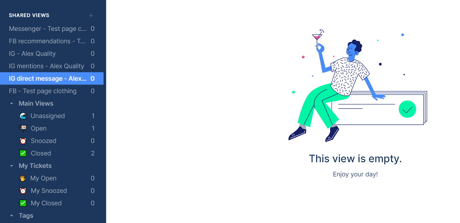 Kada povežete sve svoje račune društvenih medija, Gorgias će ih uredno organizirati u sustavu za tiketing. Možete kliknuti na različite dijeljene preglede kako biste vidjeli poruke s Messengera, preporuke s FB-a, spominjanja s IG-a, izravne poruke s IG-a i još više, ili manje, ovisno o postavkama koje su odabrane tijekom procesa integracije.