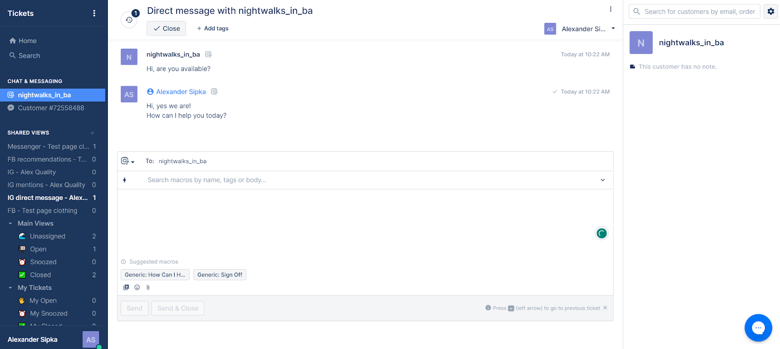 Integracija s Instagramom radi jednako dobro. Poruka je stigla vrlo brzo, a Gorgias je prikazao obavijest, kao i zvučni efekt, kako bi me obavijestio o dolazećoj izravnoj poruci. Značajke su gotovo iste u tiketingu za izravne poruke putem Instagrama, a jedina promjena je što ne mogu slati slike, samo videozapise.