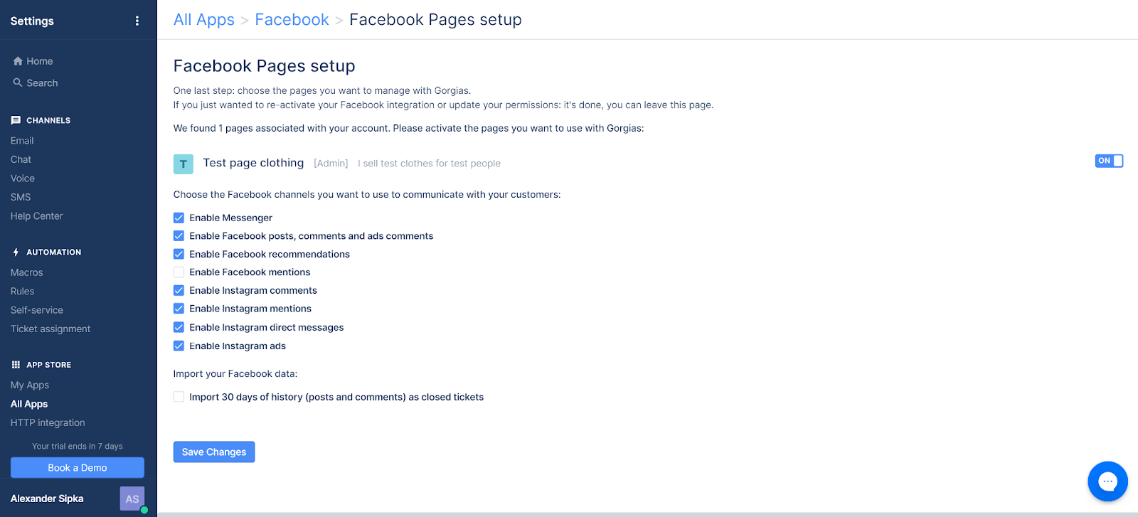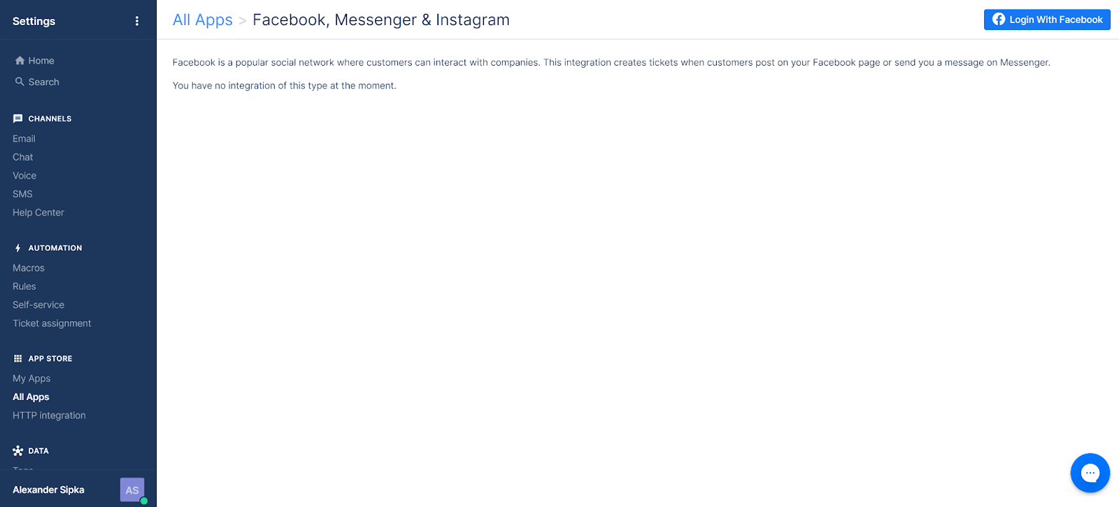 Dok se većina integracija kanala poput emaila, SMS-a, glasa ili chata nalazi u odjeljku Kanali unutar Gorgias-ovih postavki, društveni mediji su dostupni na drugom mjestu. Otvorite postavke u vašem računu i idite na Trgovinu aplikacijama > Moje aplikacije. Facebook integraciju možete pronaći ovdje. Integracija je izravno povezana s Instagram integracijom.