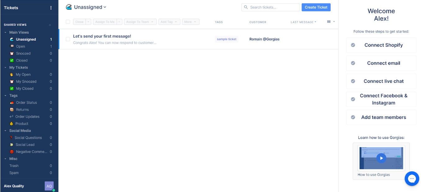 Glavni zaslon je sustav za izdavanje tiketa, koji pruža lako fokusiranje na trenutne zadatke. Gorgias ima jako malo ometanja u sučelju, što je sjajna stvar kod sustava za korisničku podršku i upravljanje društvenim medijima. Mogao sam pristupiti svim kategorijama tiketa na lijevom panelu, dok se glavni zaslon fokusira na trenutni zadatak. Desni panel služi kao praktični vodič za postavljanje koji me je proveo kroz postavku različitih kanala, uključujući Facebook i Instagram.