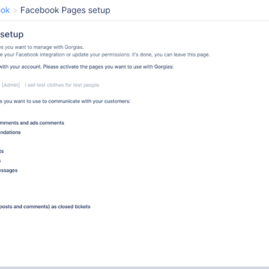 Kada kliknete na postavljanje društvenih medija, sučelje je vrlo jednostavno, sa samo kratkim objašnjenjem o tome kako integracija funkcionira i mogućnosti prijave putem Facebooka. Proces je izuzetno jednostavan i završila sam ga bez ikakvih problema. Velik dio postavljanja je opcija odabira koje dijelove vaše komunikacije na Facebooku će Gorgias preuzeti u vaš sustav. Možete omogućiti komentare, spominjanja, poruke iz Messengera i puno više u ovom dijelu postavljanja.
