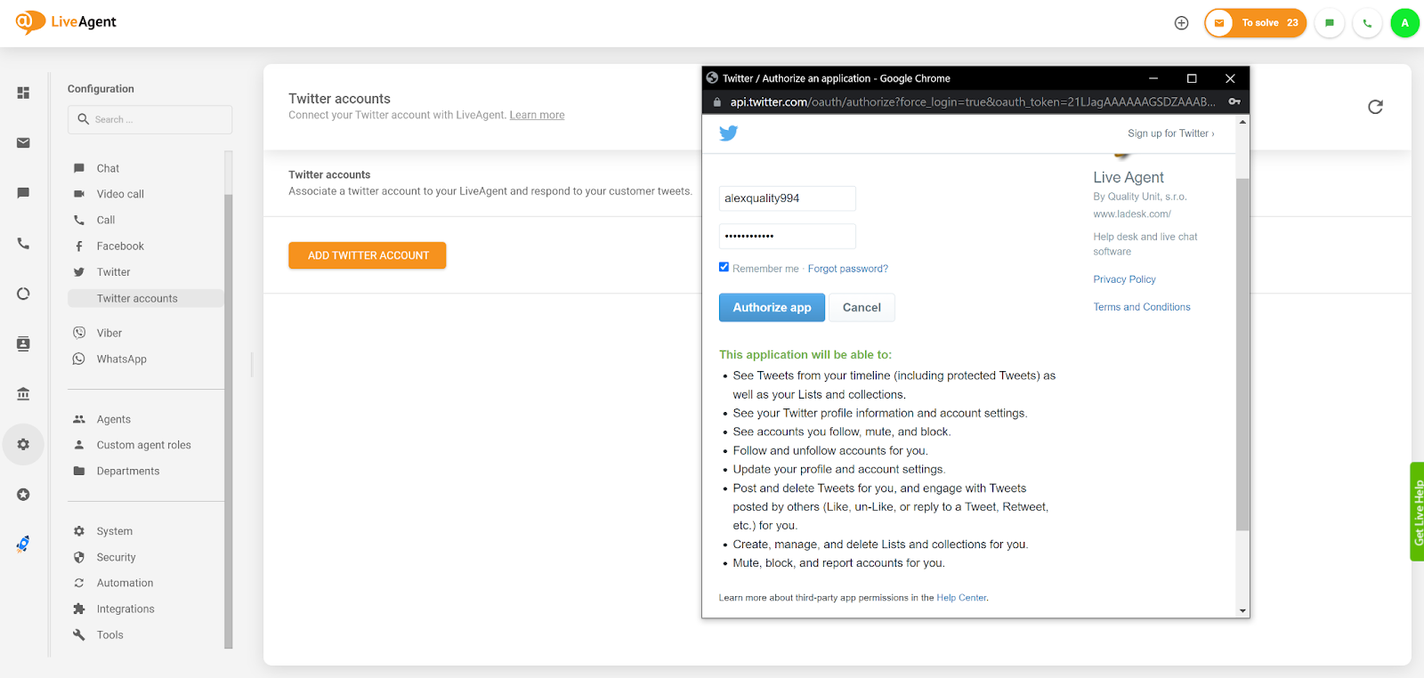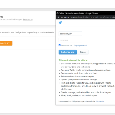 To je to. Povezivanje s Facebookom bilo je vrlo jednostavno i trajalo je manje od minute. Sljedeći korak bio je saznati je li isto tako jednostavno s integracijom Twittera. Opcija je dostupna u istom odjeljku izbornika pod Postavkama u LiveAgent-u. Jednostavno morate dodati svoj račun i dati dozvole LiveAgentu, baš kao i u prethodnom koraku. Ovaj proces će trajati čak manje vremena nego integracija s Facebookom.