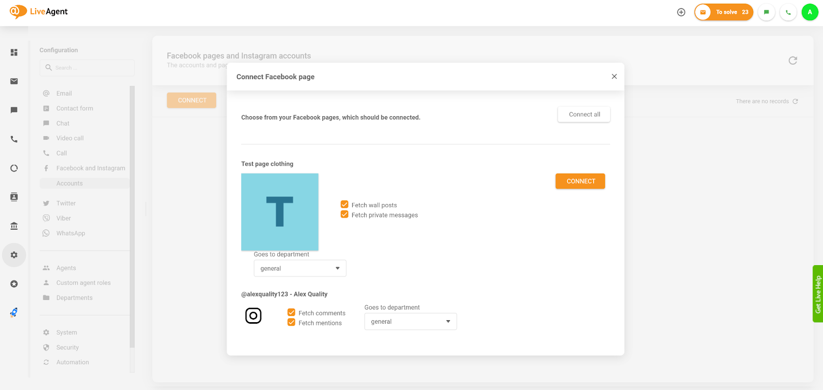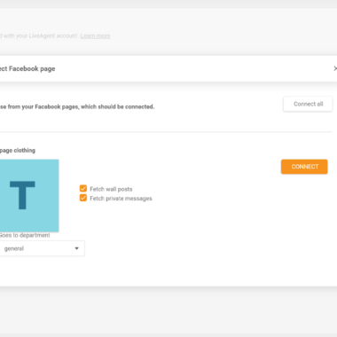 Prva opcija nudi integraciju s Facebookom, pa sam tu opciju odabrala za početak. Jednostavno sam se morala prijaviti na svoj Facebook račun i pružiti sve potrebne dozvole za Facebook stranicu svog fiktivnog modnog poduzeća. Nakon što sam dobila poruku da je integracija uspješna, mogla sam odabrati koje vrste objava dopuštam LiveAgent-u da se poveže s njima. Odabrala sam sve kako bih to učinila jednostavnim. Lijep detalj je opcija izbora kojem će odjelu u LiveAgent-u biti omogućen pristup Facebook tiketima, dajući vam slobodu da organizirate vašu komunikaciju prema tome.