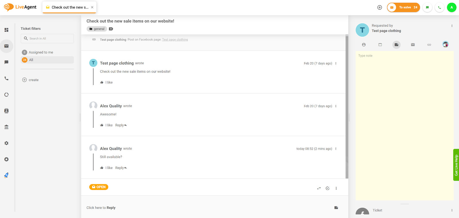 Testiranje kanala društvenih medija i značajki u LiveAgent-u je bilo zadovoljstvo. Koristila sam svoje testne račune na društvenim medijima kako bih simulirala iskustvo agenta i moram reći da su svi oni dobro funkcionirali. Prvo sam napisala komentar na Facebook statusu svog poslovnog profila kako bih saznala radi li integracija kako treba. Komentar je stigao za nekoliko sekundi i pojavio se kao tiket u mom univerzalnom sandučiću.
