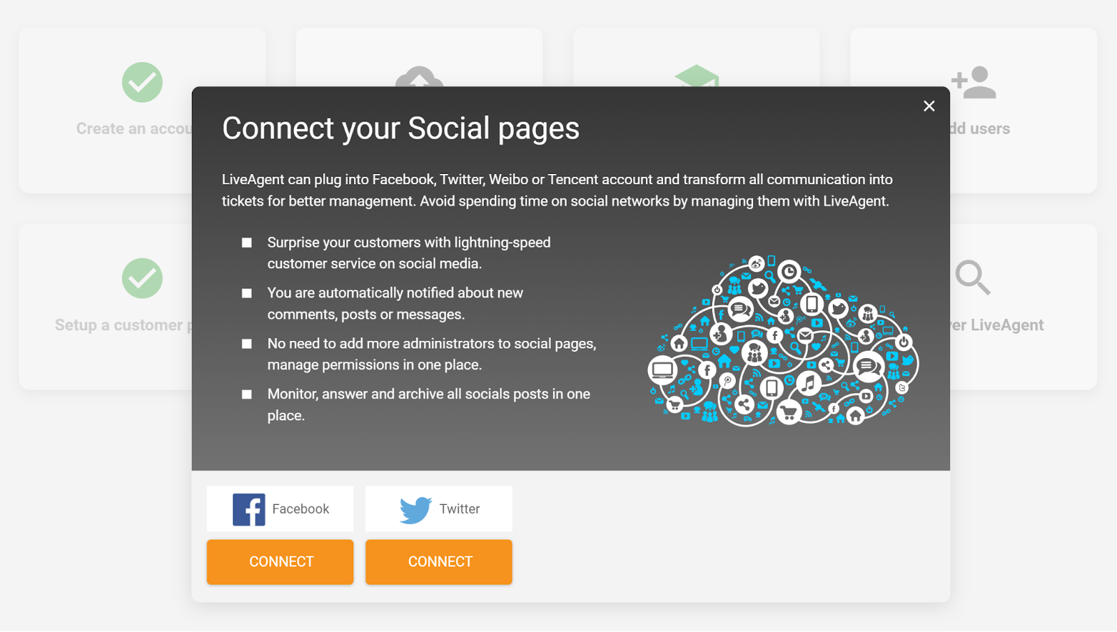 Ovaj vodič može vas provesti kroz cijeli postupak postavljanja vašeg LiveAgent računa. Možete dodavati emailove, postaviti chat i pozivni centar te dodati svoj račun društvenih medija sa svakim pojedinačnim korakom koji vidite na zaslonu. Samo je na vama (i vašem planu pretplate) da odaberete koje alate želite prvo koristiti. Možete odmah odabrati opciju društvenih medija i početi dodavati vaš račun u sustav za tiketing.