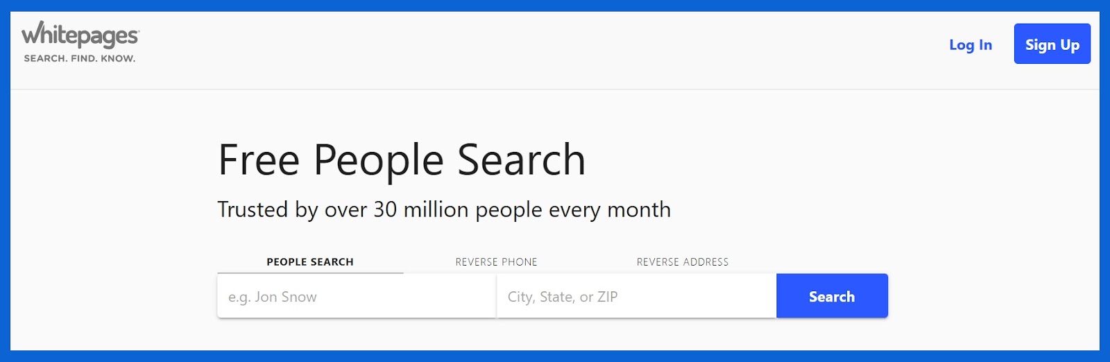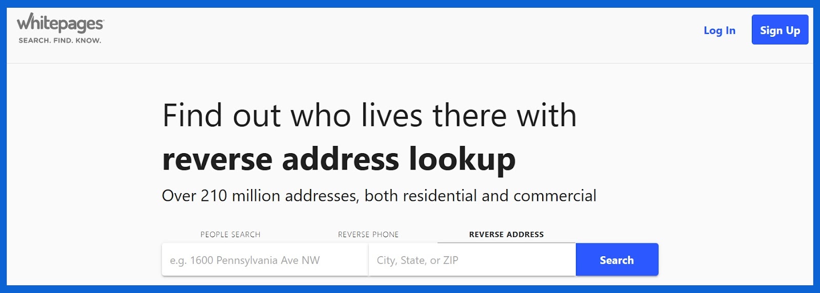 Whitepages je besplatna usluga za povratnu pretragu telefonskih brojeva koja omogućuje da brzo saznate tko je zvao s nepoznatog broja time što ćete unijeti broj u traku za pretragu. Možete saznati puno ime, adresu i druge informacije o vlasniku telefonskog broja.