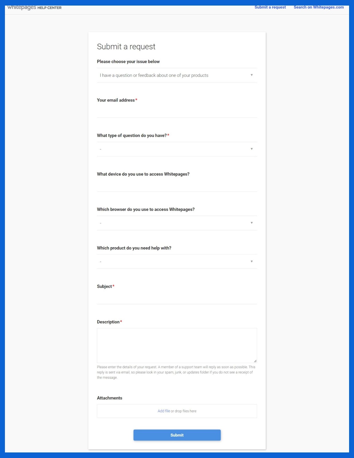 Možete se povezati s Whitepages-ovom korisničkom podrškom tako što ćete popuniti obrazac za zahtjev na njihovoj web stranici. Oni ne nude live chat niti instant korisničku podršku.