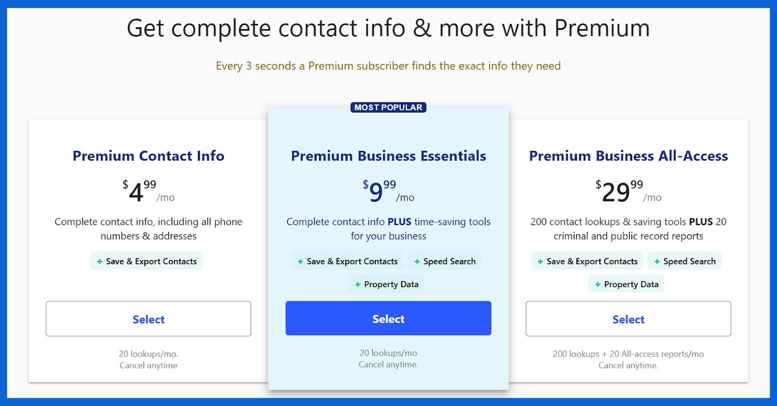 Za $4.99 mjesečno, ovo je najjeftinija opcija koju nude. Ova pretplata uključuje potpune kontakt informacije plus sve telefonske brojeve i adrese. Također možete sačuvati i izvesti kontakte. Međutim, ograničena je na 20 pretraga mjesečno. Kada odaberete ovu opciju, daje vam dva ciklusa naplate za izabrati. Možete plaćati $4.99 mjesečno ili platiti unaprijed za 12 mjesec, što će vas koštati $29.99, to jest $2.50 mjesečno.